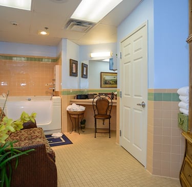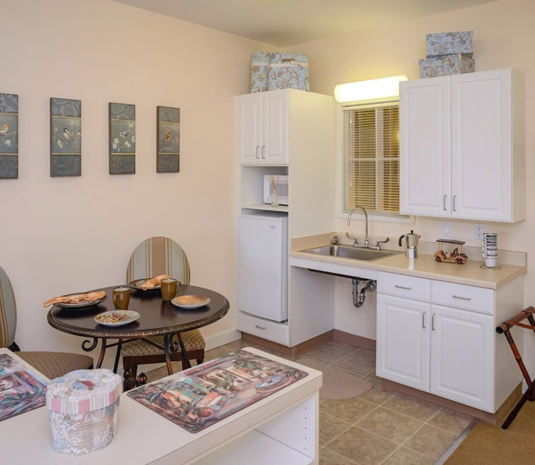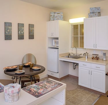 Apartments are thoughtfully designed with safety and comfort in mind, featuring a kitchenette, private bathroom, and living area. Resident safety is a top priority, and all living spaces are equipped with safety features such as smoke detectors, pull chains, and grab bars. The care team is available 24/7 to provide assistance whenever needed.